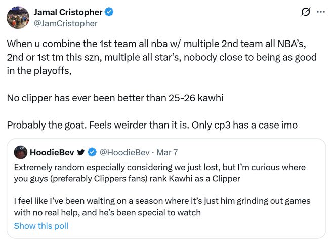 快船队记Jamal Cristopher就称赞到:“小卡曾多次入选一阵、二阵,本赛季同样有望入选,加上多次全明星与季后赛出色的表现,快船队史没有哪个球员能够比得上本赛季的小卡。”