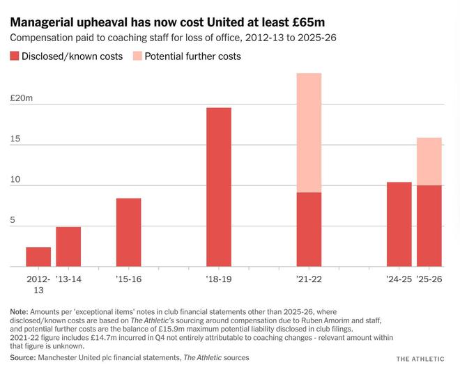 对财务状况而言,或许更重要的是继续聘用以及——这在足球界很可能发生,尤其是在近期的曼联——最终解雇卡里克需要花费多少。就像球员薪水一样,主教练的薪水从未可靠地公开过,但可以合理地认为,如果他留在老特拉福德教练席,俱乐部花费会比聘请一位更受追捧、名气更大的人物要少。相应地,如果事情进展不顺,解雇他的成本也会更低。一月初解雇阿莫林及其教练组,使曼联面临最高1590万英镑的和解赔偿金,这与近年来一系列类似的支出相当。解雇滕哈格花费了1040万英镑;三年前解雇索尔斯克亚花费了910万英镑;2018年12月解雇若泽-穆里尼奥花费了1960万英镑——这是俱乐部历史上支付给主教练的最高和解金。