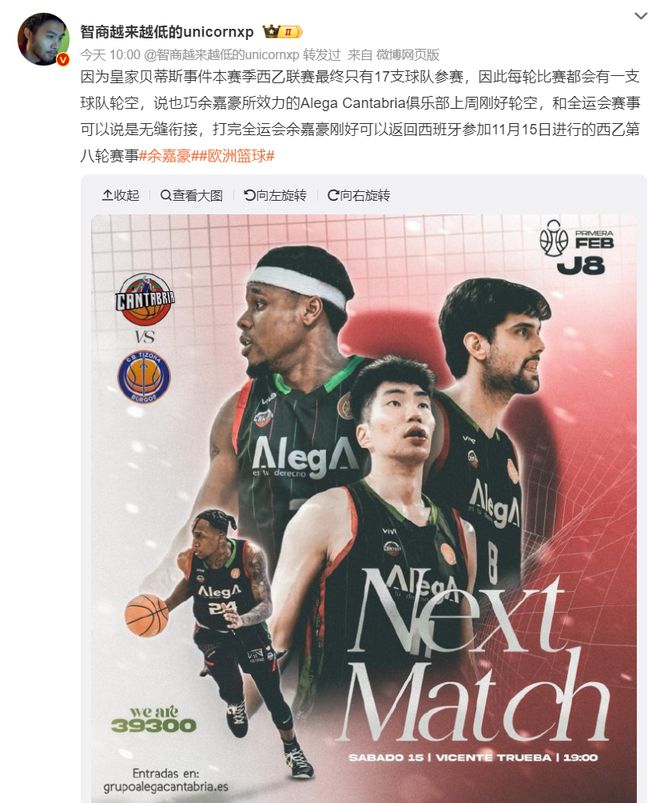 欧洲篮球专家王健也表示,因为皇家贝斯迪事件本赛季西乙只有17支球队参赛,每轮比赛会有一支球队轮空,埃斯特拉男篮上周刚好轮空跟全运会比赛无缝衔接,下一场比赛是在11月15日。(对啊,那余嘉豪11月12日晚打完全运会决赛再回西班牙也不迟啊)