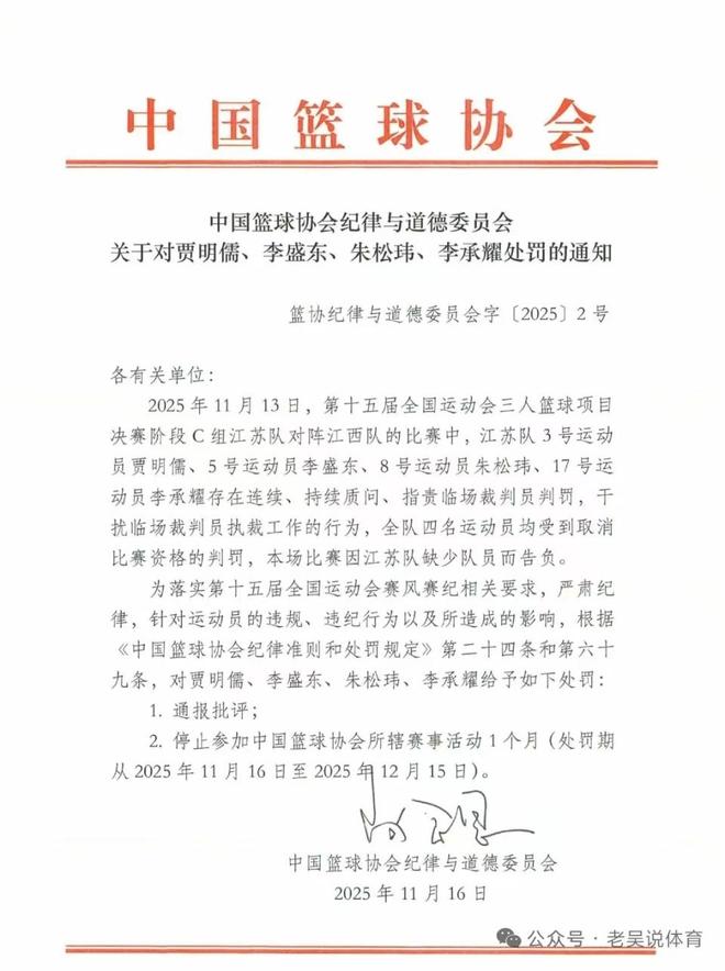 另外,在全运会三人篮球项目上,篮协给予朱松玮、贾明儒、李盛东、李承耀4名球员禁赛1个月的处罚,处罚期从2025年11月16日至12月15日。