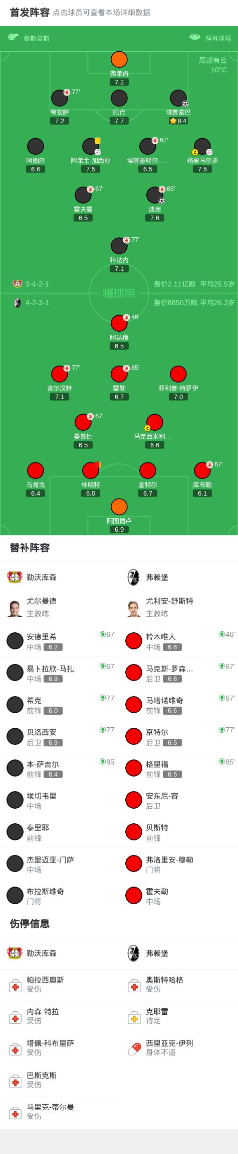 勒沃库森vs弗赖堡:格里马尔多、霍夫曼首发,金特尔、阿达穆出战